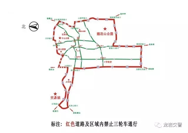 根据市政府《关于龙岩中心城区三轮车禁行区域的公告》(公告7号),2017年6月20日零时起实行的禁行区域范围如图: