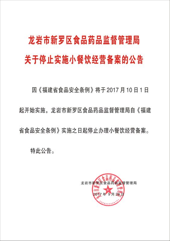 龙岩市新罗区食品药品监督管理局关于停止实施小餐饮经营备案的公告