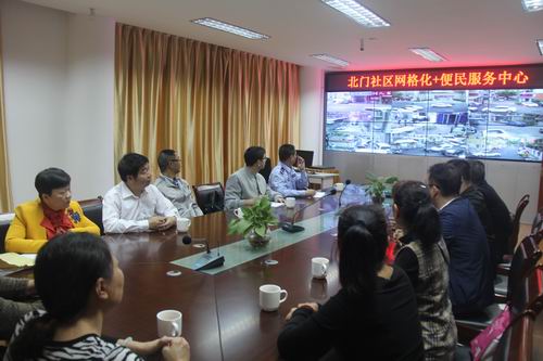 在中城街道北门社区,廖继清一行参观了北门大妈平安志愿者工作站、社区综治维稳中心等,并与北门大妈深入交流社区平安志愿者工作的开展情况,对北门大妈积极参与社区平安志愿者工作表示肯定。