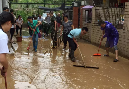16日清晨,洪水退却后,葫芦新村巷道多处被淤泥掩埋,垃圾成堆,清淤排渣工作刻不容缓,街道立即组织党员志愿者冒雨进行清淤,从早上8点到晚上6点,社区工作人员与党员志愿者们持续不断地在灾后现场开展自救,把抗洪救灾作为深入开展“两学一做”教育活动的主战场,率先垂范,奋力抢险救灾。17日,社区工作人员和党员志愿者放弃双休日,坚守各自岗位,各负其责、各司其职,依旧坚守在现场。社区共建单位——市委党校、市电视台、市统计局、区人社局闻讯后,带领70余人自带着水桶、铁锹、扫把、斗车等救灾清扫工具也加入到了清淤队伍,共同清扫淤泥、铲除垃圾、冲洗巷道。整个过程一直持续到下午5点,葫芦新村受灾巷道上的淤泥全部清除并冲洗干净。