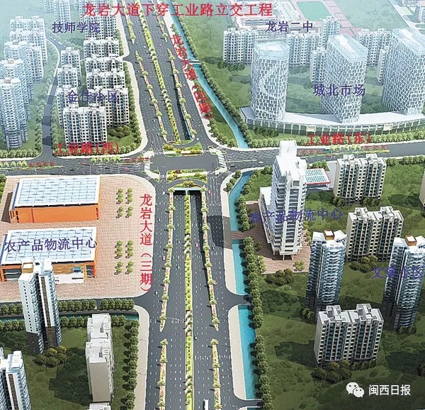 项目位于龙岩大道与工业路交叉口,为现状龙岩大道三期道路上设置下穿通道,起始于规划支路农产品物流配送中心路口,终止于龙岩大道四期龙岩第一技师学院东侧,全长383米,其中框架涵长度80米,U型槽长度303米,地道净宽2×13米,双向六车道。主通道两侧设置两道南北向人行地下通道,人行通道断面型式:5×3.5米,主通道长124米,梯道长128米,总投资约2亿元。