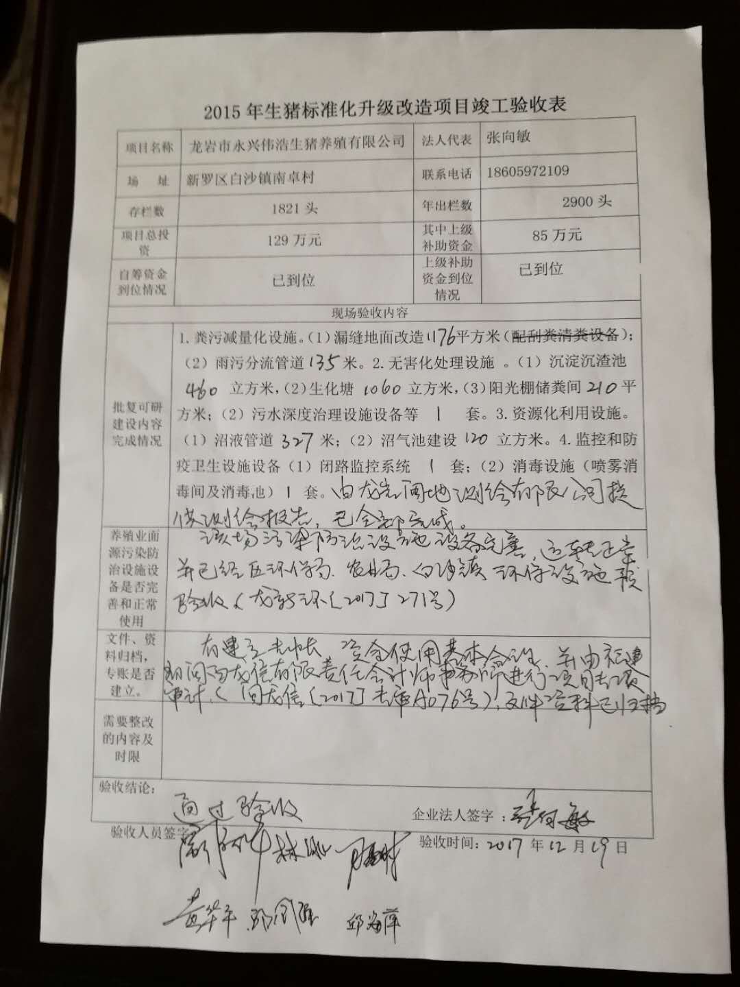 根据《龙岩市农业局龙岩市财政局关于对2015年生猪标准化升级改造项目实施方案的批复》(龙农[2015]210号)文,龙岩市永兴伟浩生猪养殖有限公司为2015年生猪标准化升级改造项目实施场,项目总投资为129万元,其中财政补助均为85万元。2017年12月19日区农业局牵头组织了区环保局、财政局及白沙镇兽医站等相关单位专家组成项目验收小组进行了现场验收。验收组一致同意龙岩市永兴伟浩生猪养殖有限公司生猪标准化升级改造项目通过验收。现将项目的验收结果进行公示,公示5天(2017年12月28日-2018年1月4日)。如有异议,可通过书面或电子邮件形式向区农业局、财政局反映。反映情况要实事求是,以便调查核实。