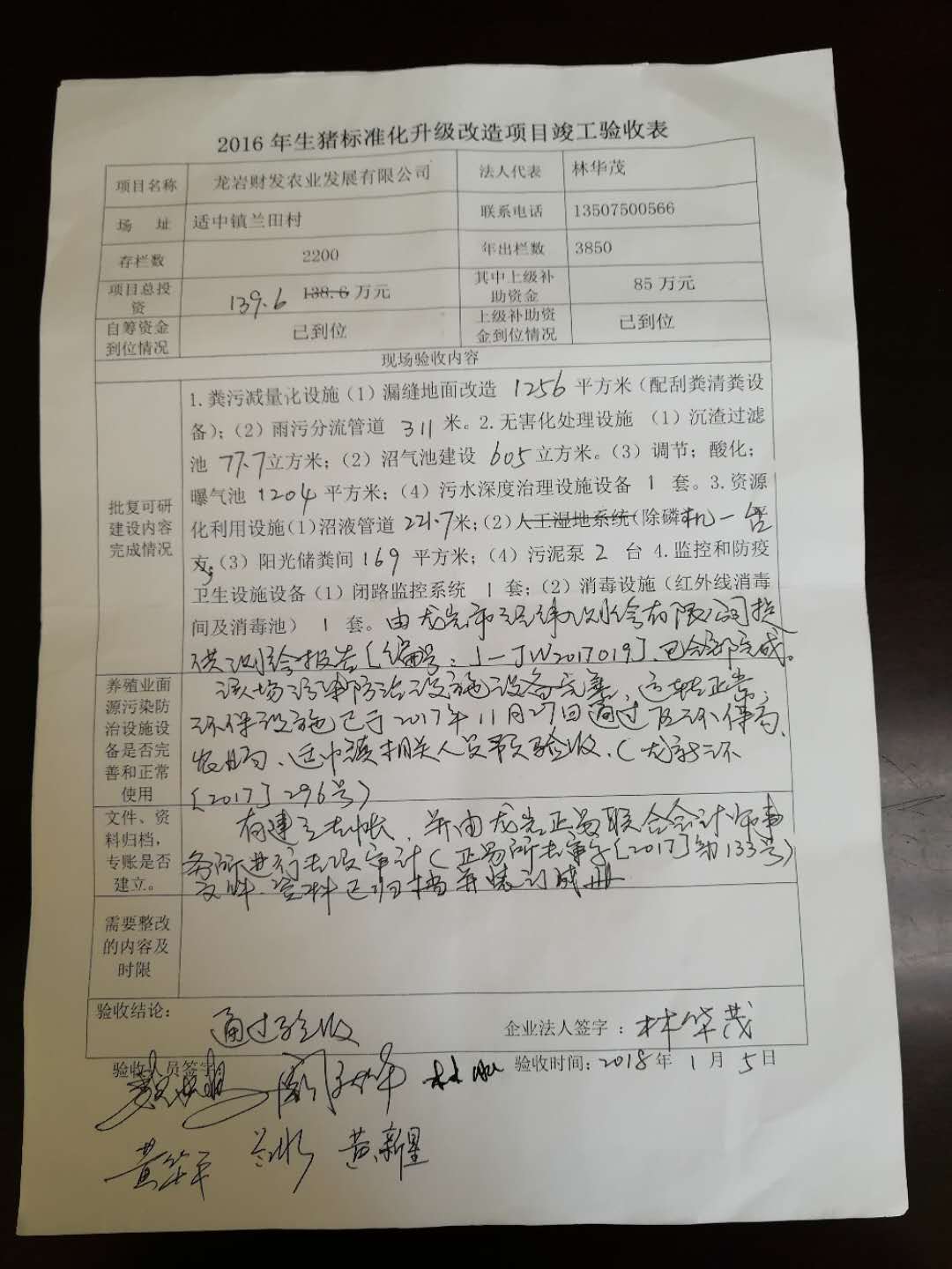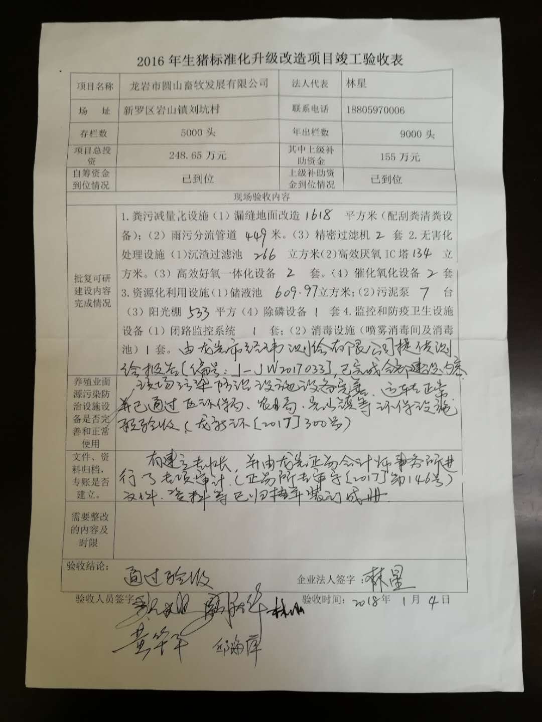根据龙岩市农业局、龙岩市环保局、龙岩市财政局《关于新罗区、上杭、连城县2016年生猪养殖场标准化升级改造项目实施方案的批复》(龙农[2016]355号)文,龙岩市圆山畜牧发展有限公司、龙岩市财发农业发展有限公司标准化改造项目总投资分别为248.65万元、139.6万元;其中财政补助分别为155万元、85万元。项目场严格按批复的实施方案建设竣工,猪场污水已经新罗区环保局环境监测站检测合格,通过了区环保局、农业局、项目所在镇等部门环保设施预验收(龙新环[2017]300号、龙新环[2017]296号),并书面提出项目验收申请。2018年1月4日、1月5日区农业局牵头组织了区环保局、财政局及项目所在镇兽医站等相关单位专家组成项目验收小组对项目场进行了现场验收,验收组一致同意龙岩市圆山畜牧发展有限公司、龙岩市财发农业发展有限公司标准化改造项目通过竣工验收。现将项目的验收结果进行公示,公示5天(2018年1月11日-18日)。如有异议,可通过书面或电子邮件形式向区农业局、区环保局、区财政局反映。反映情况要实事求是,以便调查核实。