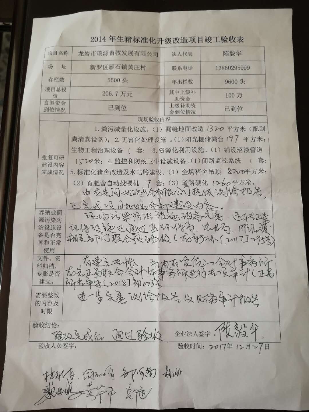 根据(龙发改农业[2013]29号)及(龙发改农业[2014]40号)文,龙岩市瑞源畜牧发展有限公司为2014年度中央资金生猪标准化建设项目单位,项目总投资分别为206.7万元,其中中央预算内投资为100万元。项目场严格按批复的实施方案建设竣工,猪场污水已经新罗区环保局环境监测站检测合格,通过了区环保局、农业局、项目所在镇等部门环保设施联合预验收(龙新环[2017]295号),并书面提出项目验收申请。2017年12月27日区农业局牵头组织了区环保局、财政局及项目所在镇雁石镇兽医站等相关单位专家组成项目验收小组对项目场进行了现场验收,验收组提出进一步完善测绘报告及财务审计报告等整改要求,现该公司已完成整改,同意龙岩市瑞源畜牧发展有限公司生猪标准化建设项目通过竣工验收。现将项目的验收结果进行公示,公示5个工作日(2018年1月16日-22日)。如有异议,可通过书面或电子邮件形式向区农业局、区环保局、区财政局反映。反映情况要实事求是,以便调查核实。